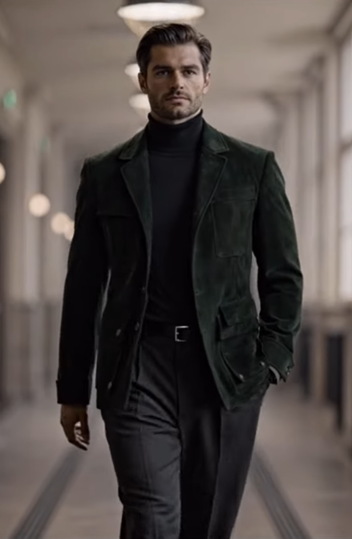 Volumes that root themselves in the earth: wide, grounded, prosperous below — then rising into fitted forms that hold the body close, with the quiet confidence of one who knows his own strength.